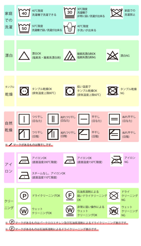 ただし、商品によっては洗濯機OKのものもあります。その場合は、洗濯表示に従ってお手入れ下さい。もし洗濯表示が分からない場合は、手洗いにしておきましょう。