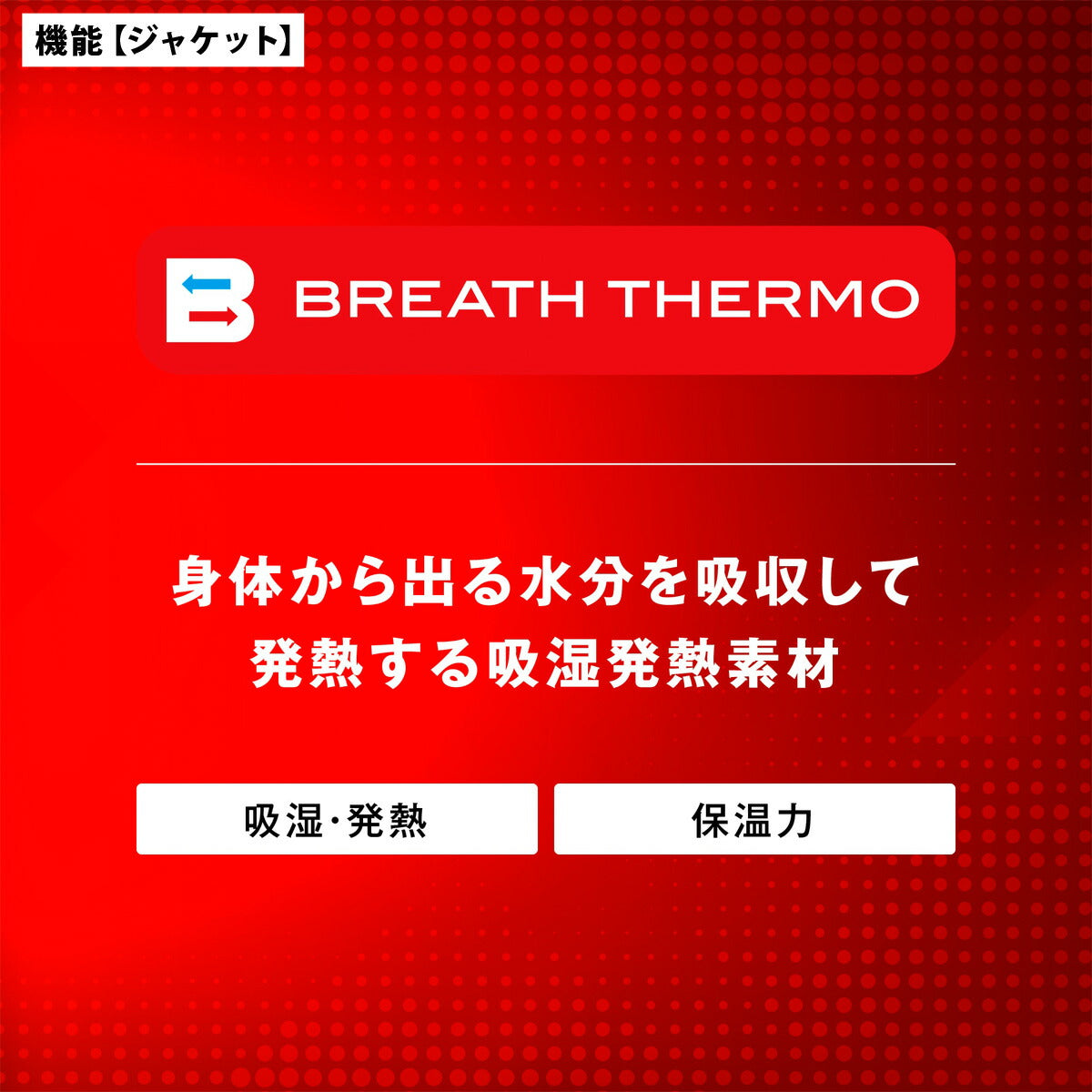 | 機 能 | 【BREATH THERMO ブレスサーモ】 体から発生する水分を吸収し発熱する快適な保温素材。汗をかいてもムレにくく、ドライで快適な衣服内環境を保ちます。 【PROOF PLUS はっ水】 MIZUNO PROOF PLUS/WATERは、撥水性が優れていることを示し、優れた撥水性でウェア内を快適な状況に保ちます。 【Techfill テックフィル】 ミズノテックフィルは、ふくらみがあり、あたたかさをキープ。洗濯可能なスポーツに適した中綿繊維です。 |