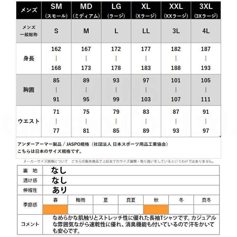 | 生地感 | なめらかな肌触りとストレッチ性に優れた長袖Tシャツです。カジュアルな雰囲気ながら速乾性に優れ、消臭機能も付いているので汗をかいても安心です。 |
