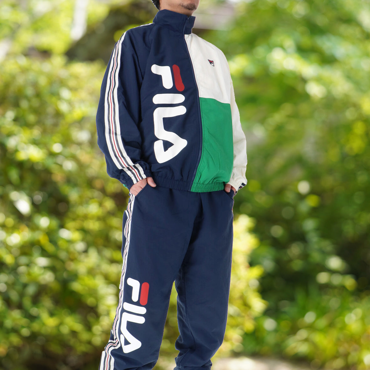 | 特 徴 | ジャケット/90年代のストリートシーンを彷彿とさせる、大胆な切り替えデザインが特徴のトラックジャケットが登場。 右身頃にはインパクト大な縦配置のリニアロゴ、左身頃はネイビー×レッドのクラシックなカラーブロックを採用し、袖ラインには「セブンストライプ」を配し、スポーティなアクセントをプラスしました。 身幅にゆとりを持たせたオーバーサイズ仕様で、ラフに羽織るだけで、こなれたストリートスタイルが完成します。 パンツ/FILAのヘリテージラインを象徴する「HR TRACK PANTS」。 サイドにあしらわれたブランドのアイコン「セブンストライプ」が、クラシカルかつオーセンティックな雰囲気を演出します。 最大の特徴は、右足に大胆にプリントされた「リニアロゴ」。 シンプルになりがちなトラックパンツに強烈な個性をプラスしました。 形はルーズになりすぎない綺麗な「ストレートシルエット」を採用。 リラックス感がありながらも、脚のラインをすっきりと見せてくれます。 タウンユースからアクティブシーンまで幅広く活躍するアイテムです。 |
