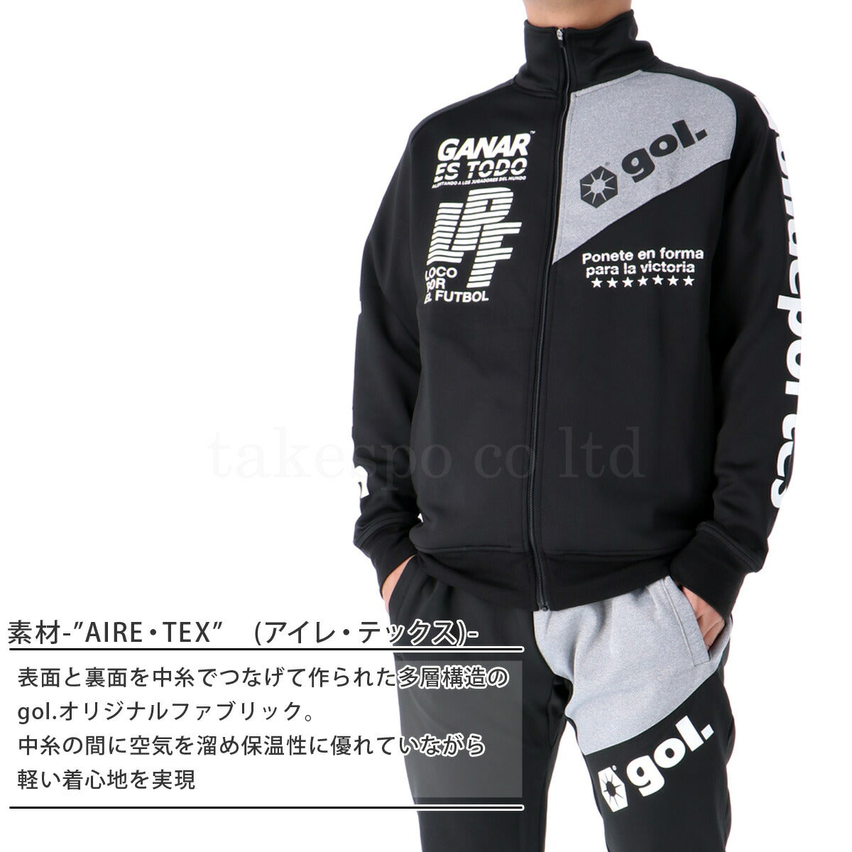 | 特 徴 | 今までのジャージと格段に違うのは素材! その名も ”AIRE・TEX” (アイレ・テックス) 意味はAIREが空気のスペイン語。 TEXはテキスタイル(織物の英語)の略称。 表面と裏面を中糸でつなげて作られた多層構造のgol.オリジナルファブリック。 中糸の間に空気を溜め保温性に優れていながら軽い着心地を実現している。 しっかりしたハリ感があり、しわになりにくいというイージーケア性も携える。 アシンメトリーなデザインもポイント パンツシルエットはこだわりのシルエット タイトすぎず、かつ、誰でもスタイリッシュに履きこなせるシルエットです |