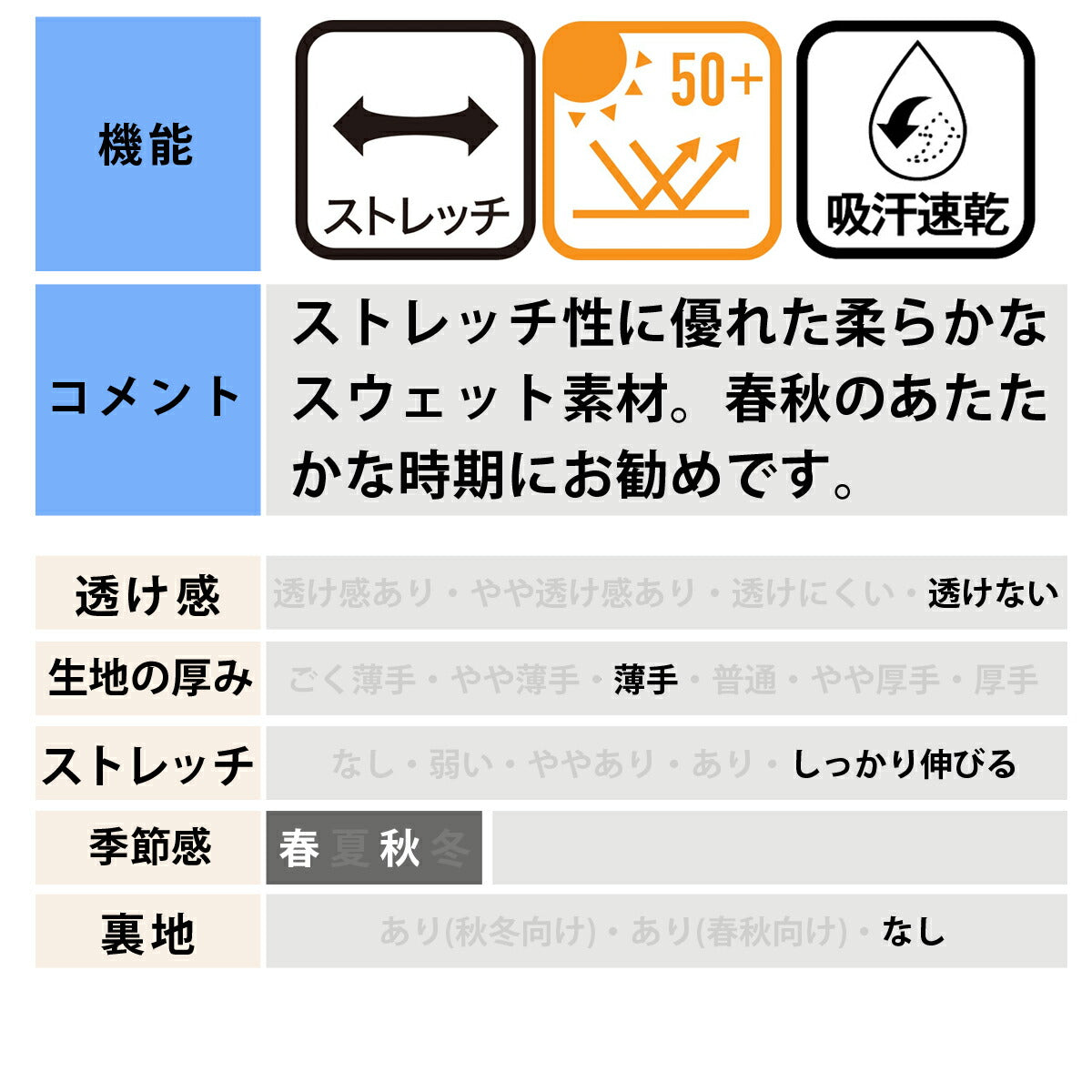 | 生地感 | ストレッチ性に優れた柔らかなスウェット素材。薄手なので春秋のあたたかな時期にお勧めです。 |